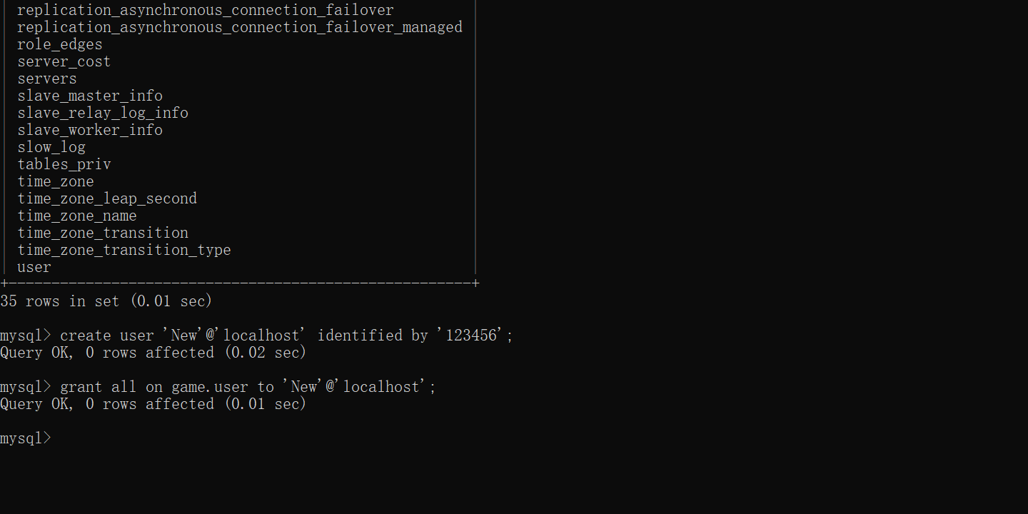 New为新建用户名,localhost为本主机,game为已有数据库的名称,game数据库中的user表。