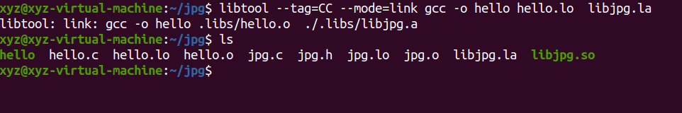 使用指令libtool --tag=CC --mode=link gcc -o libjpg.la jpg.lo链接生成库文件