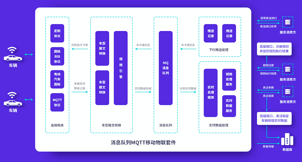- 数据上行采集:安装在车辆等执行部件上的传感器采集状态数据后,定期上传到服务端进行分析和应用。其特点是,车辆和传感器种类众多,基数大,移动数据网络大多走4G,不如固定网络稳定。