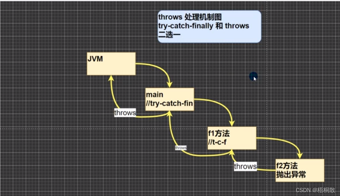 main方法由JVM调用,main方法调用 f1 方法,f1 方法调用 f2 方法,如果 f2 方法发生异常,有两种方案,分别是 try-catch-finally 和 throws ,f2 使用 throws 方法,返回给 f1,f1也可以同样选择throws方法,返回给 main 方法,最终返回到 JVM。而 JVM 对处理异常的发生极为粗暴(1.输出异常信息。2. 退出程序)。