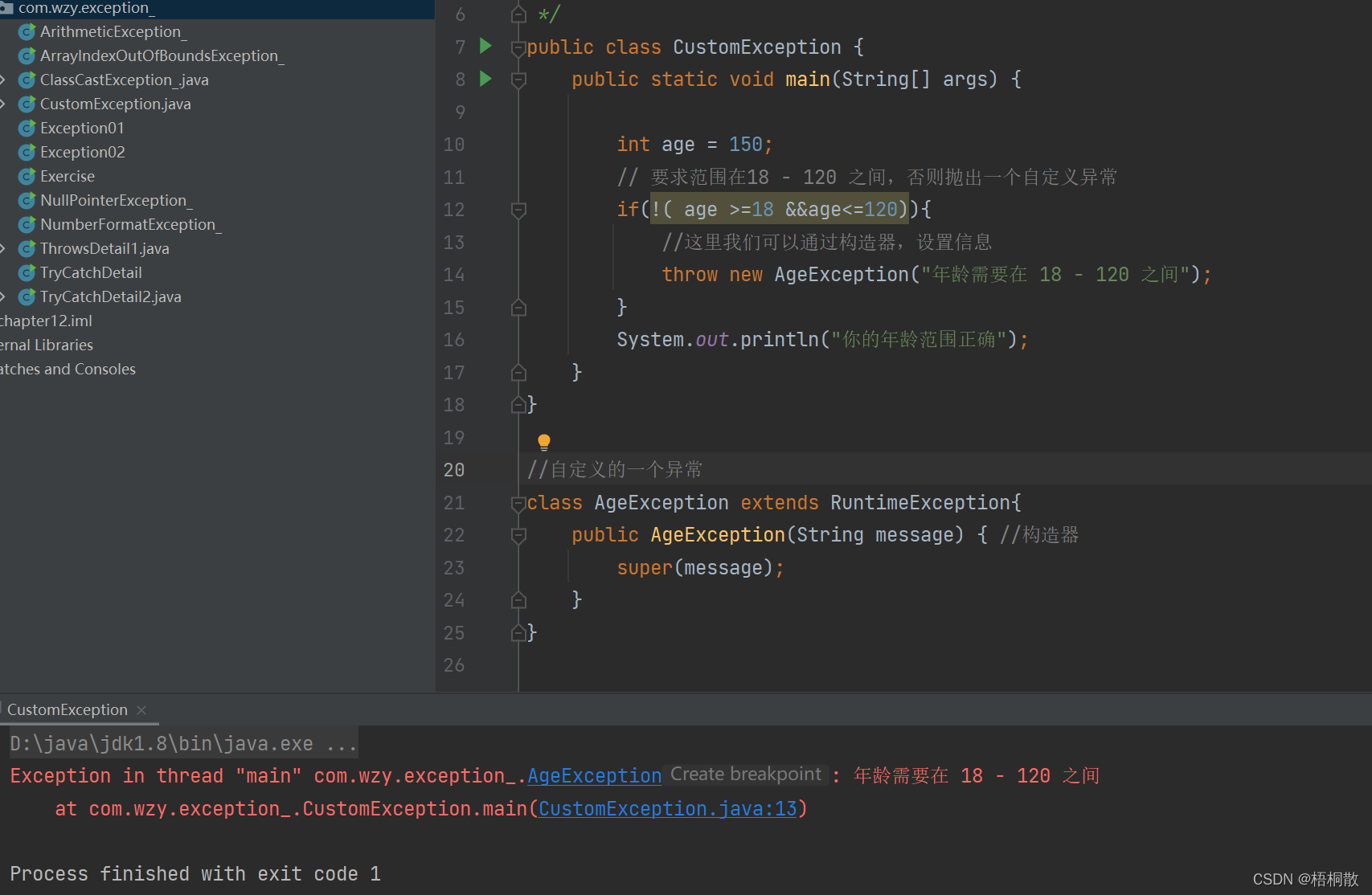 实例演示:要求:接收Person对象的年龄时,要求范围在18 - 120 之间,否则抛出一个自定义异常(要求 ,继承RuntimeException),并给出提示信息