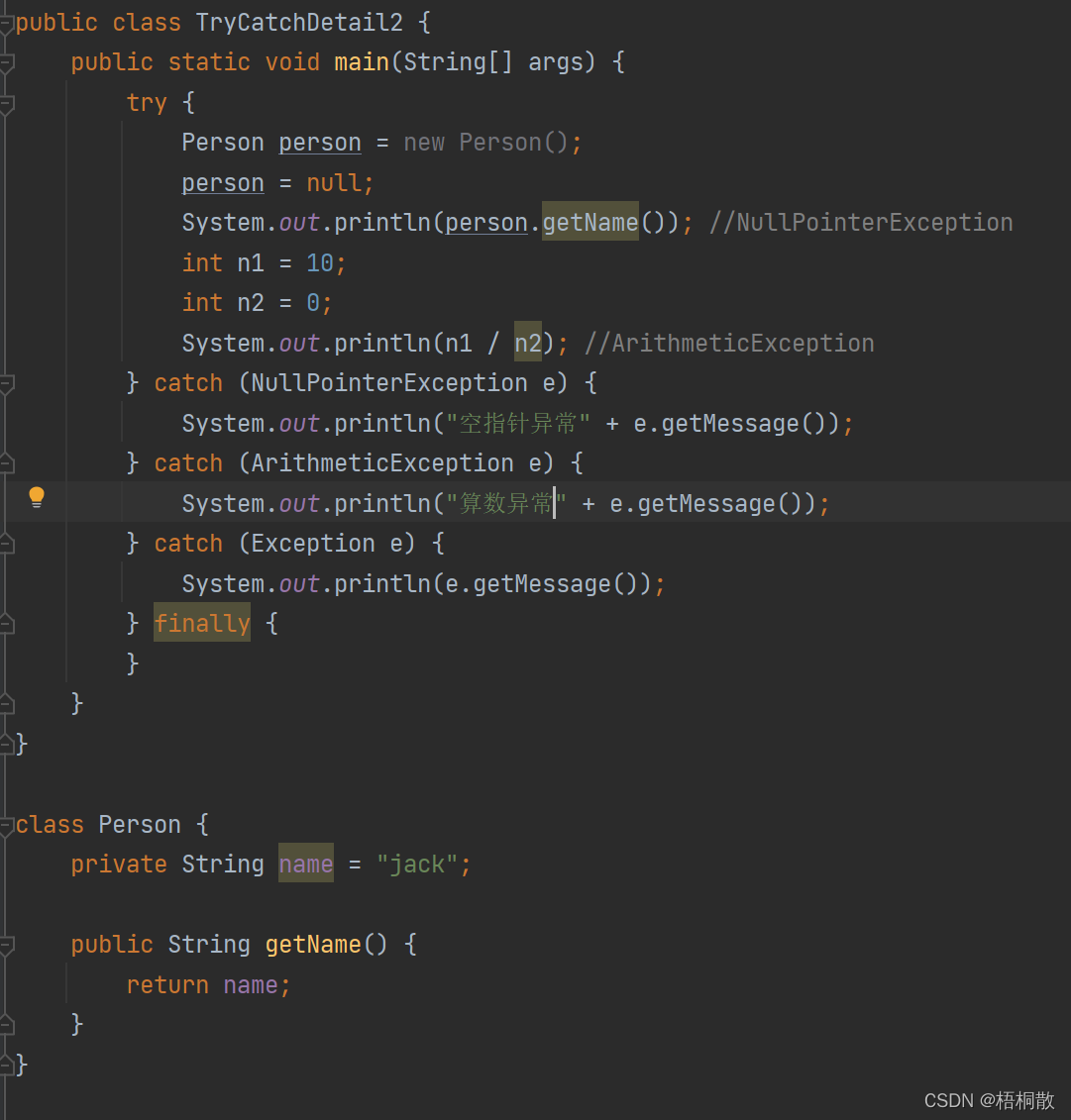 4)可以有多个catch语句,捕获不同的异常(进行不同的业务处理),要求父类异常在后,子类异常在前,比如(Exception 在后,NullPointerException在前),如果发生异常,只会匹配一个catch。