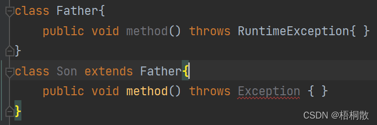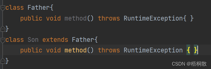 3)子类重写父类方法时,对抛出异常的规定。子类重写的方法,所抛出的异常类型要么和父类抛出的异常一致,要么为父类抛出异常类型的子类型。