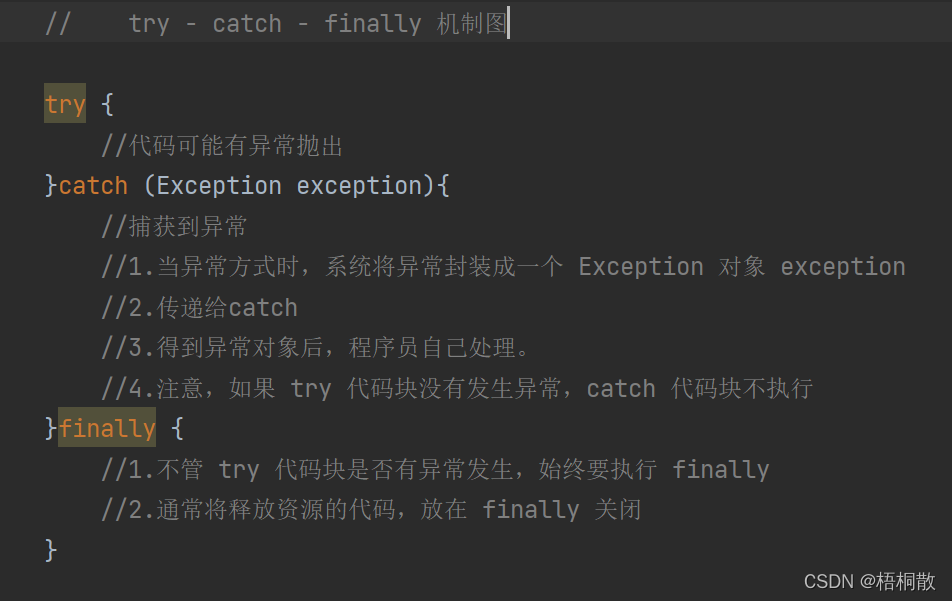 5)try - finally 可以配合使用,这种用法相当于没有捕获异常,因此程序会直接崩掉。应用场景:执行一段代码,不管是否发生异常,都必须执行某个业务逻辑。