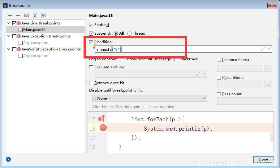 大家在循环需要debug的时候,只想要看某一符合条件的元素的debug过程,是不是还在手动的一个一个点,直到循环到符合元素。其实idea的debug是支持条件查看的。