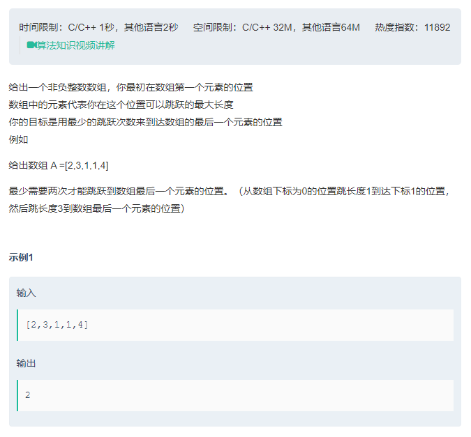 我开始想到的做法是贪心。首先维护两个指针i和cur,i用于顺序遍历,cur用来指向上一次可以跳到的最远的位置。维护一个一维数组,用来记录跳到每个位置需要的最短步数。然后考虑当前能跳到的最远距离是否超过了cur,如果超过,就把cur+1~i+A[i]这些位置的值都置为dp[i]+1;否则就不操作。我们可以保证dp[i]的值就是跳到每个位置所需最短步数,因为当dp[i]被赋值的时候,这个值被第一次访问,之后如果还有别的方法能访问到该值,其步数也必定不少于第一次访问。这个做法的时空复杂度均为O(n)。
