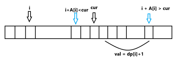for(int j = min(i + A[i], n-1); j > cur;--j)