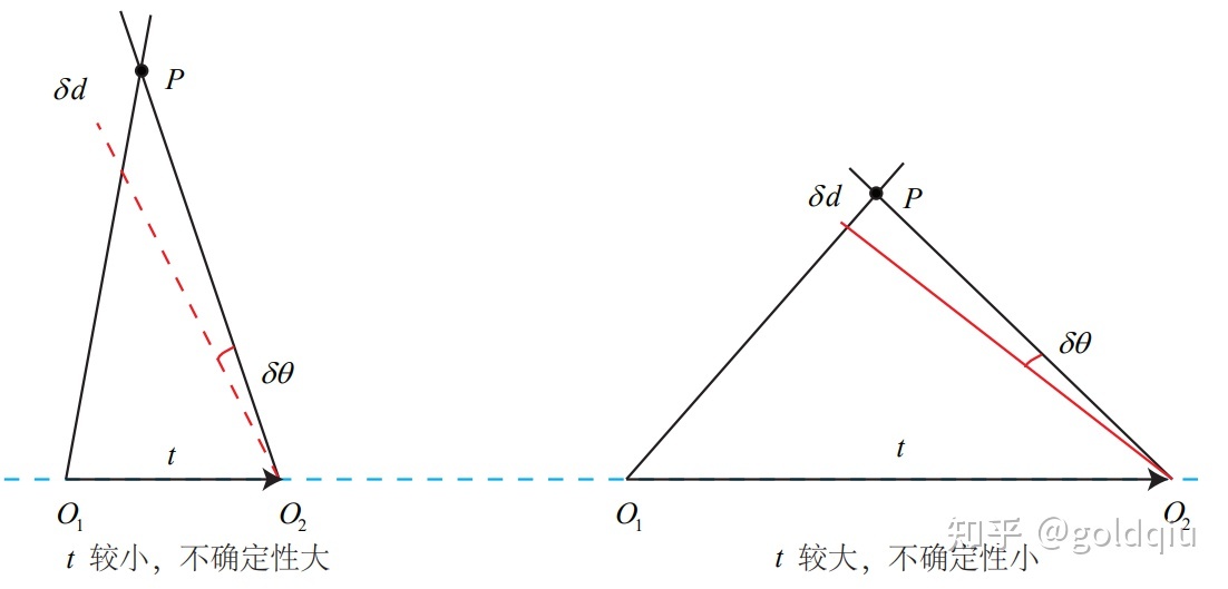 三角测量是由平移得到的,有平移才会有对极几何中的三角形,才谈的上三角测量。因此,纯旋转是无法使用三角测量的,因为对极约束将永远满足。在平移存在的情况下,还要关心三角测量的不确定性,这会引出一个三角测量的矛盾。