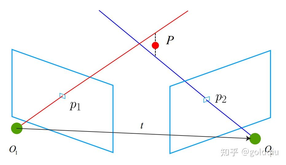 考虑图像 I1 和 I2,以左图为参考,右图的变换矩阵为 T。相机光心 为 O1 和 O2。在 I1 中有特征点 p1,对应 I2 中有特征点 p2。理论上直线 O1p1 与 O2p2 在场景中会相交于一点 P,该点即是两个特征点所对应的地图点在三维场景中的位置。然而由于噪声的影响,这两条直线往往无法相交。因此可以通过最二小乘去求解。 按照对极几何中的定义,设 x1, x2 为两个特征点的归一化坐标,那么它们满足: s1x1 = s2Rx2 + t.