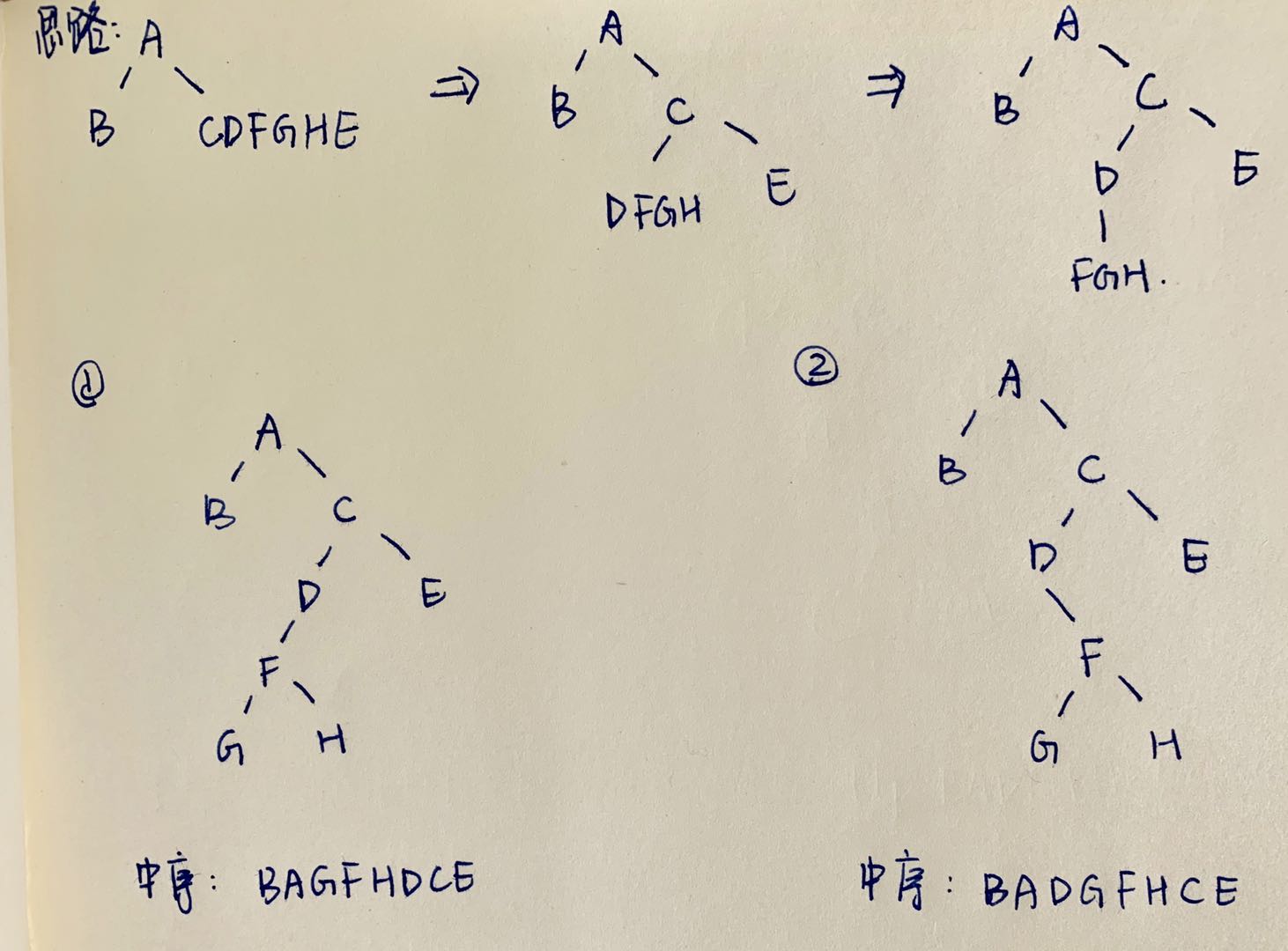 如图所示,从题目所给信息中,我们并不能判断出FGH节点在D节点的左子树还是右子树,因此存在以上两种情况,答案不唯一。