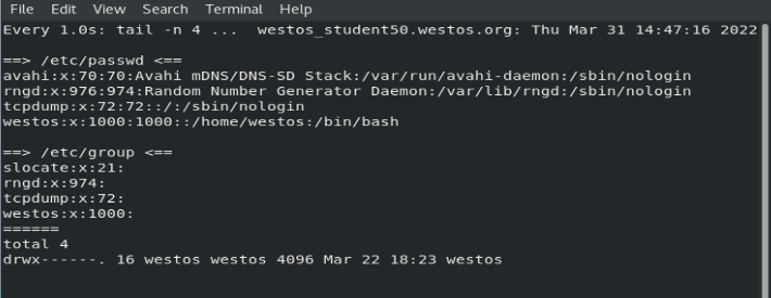 watch -n 1 "tail -n 4 /etc/passwd /etc/group;echo =====;ls -l /home"