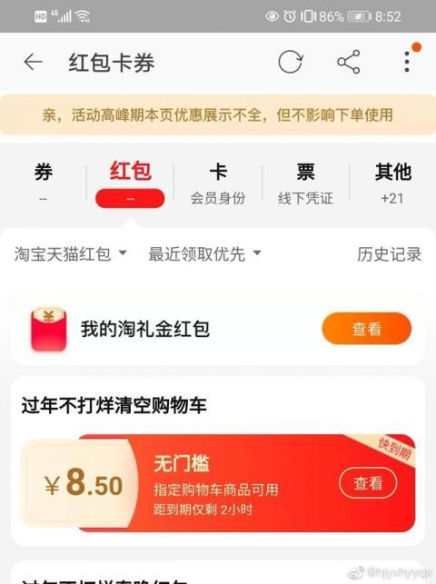 如下图所示,清空购物车大奖以无门槛红包呈现,红包的金额是购物车内商品的价格,可在两小时内使用。由于该网友的购物车内只有一个8.5元的蒸架,清空购物车大奖红包也只有 8.5 元。