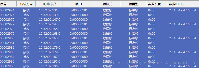 从上图可以看出,每收到2个同步帧,TPDO1发送一次,其中对象字典0x6041的值为0x1027,对象字典0x6064的值为0x6453474a。
