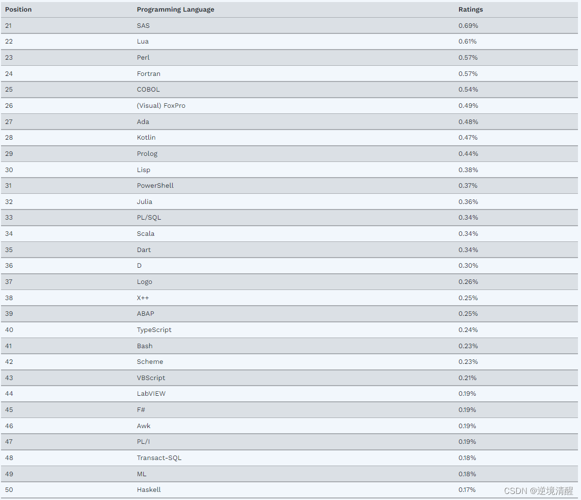 关注有前途的新编程语言总是很有趣的。这是因为它们可能成为每个人都会使用的下一件大事,没有人愿意错过。不幸的是,这些新语言中的大多数都在短时间内成为人们关注的焦点,但它们从未有过真正的突破。多年来,我们一直在等待 Kotlin、Dart、Julia 等语言进入 TIOBE 指数前 20 名,但没有成功。唯一的例外似乎是 Rust。Rust上个月进入了前20名,并在本月设法保持了自己的位置。Rust 越来越受欢迎的主要原因是它独特的速度和安全性组合。让我们看看 Rust 是否会留下来。其他有趣的消息是Lua正在从#24跃升至#22。显然,高性能语言很热门。--Paul Jansen 首席执行官 TIOBE Software