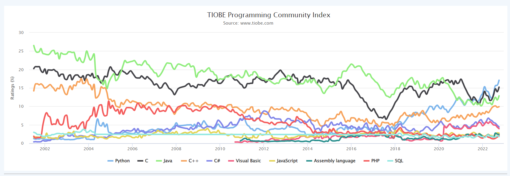 TIOBE Index编程社区指数是编程语言流行度的一个指标。评级基于全球熟练工程师的数量、课程和第三方供应商的数量。Google、Bing、Yahoo!、维基百科、亚马逊、YouTube 和百度等流行搜索引擎用于计算评级。