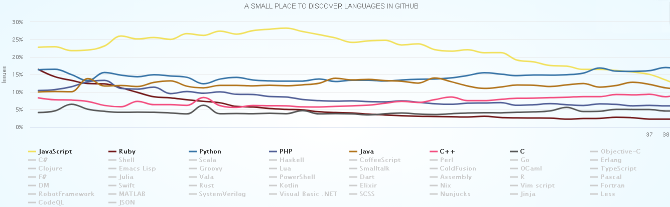 Lisp | 33 | 31 | 13 | 15 | 13 | 10 | 6 | 2 |