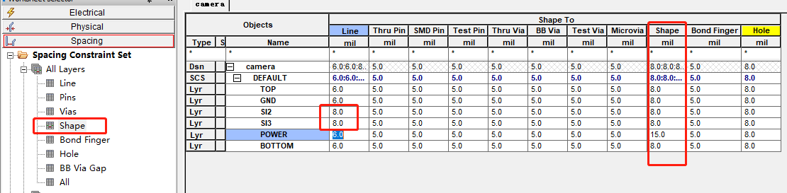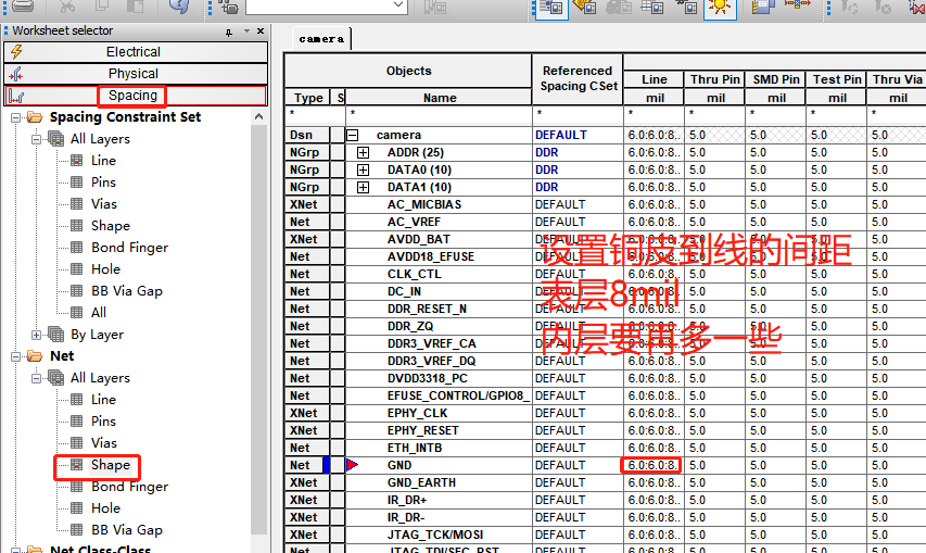 注意这个线宽,也就是间距,一般为10/12/15mil,这个是根据压差来的,压差大的话就设置大一点。