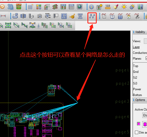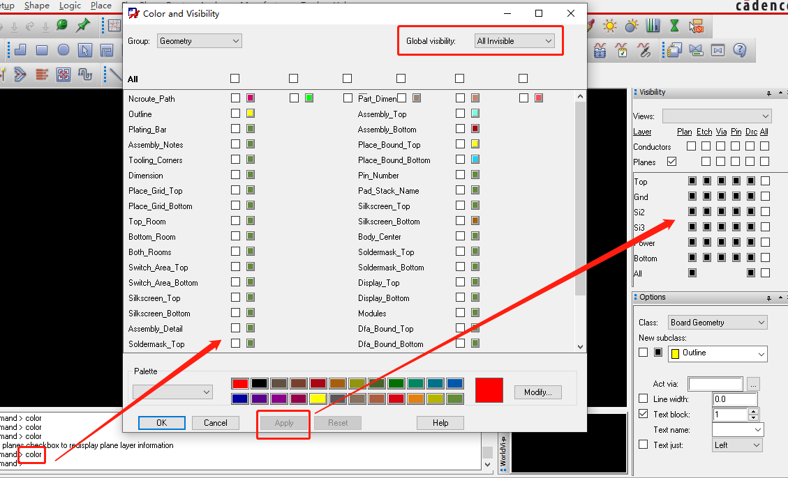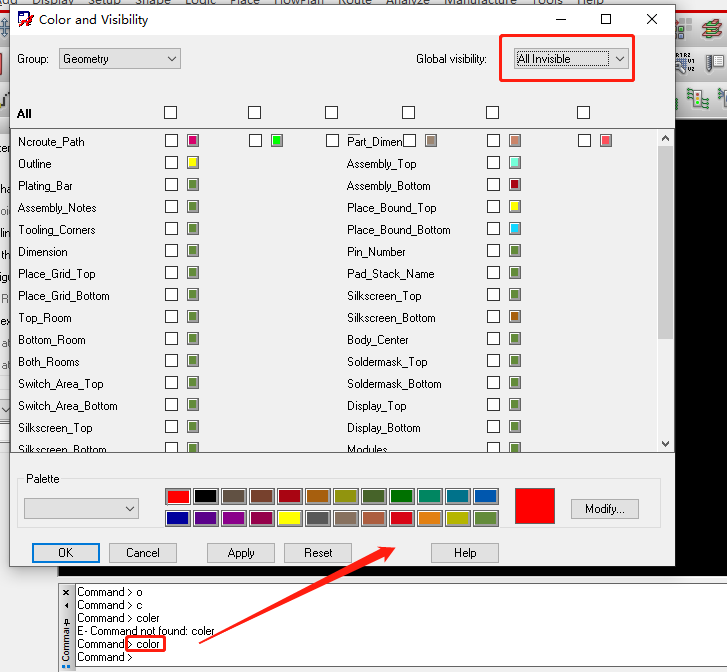 15、设置在PCB中只显示我们需要的颜色,在命令框中输入color,弹出旧版的颜色设置命令框,通过Display->Color/Visibility打开的颜色设置对话框是新版的。
