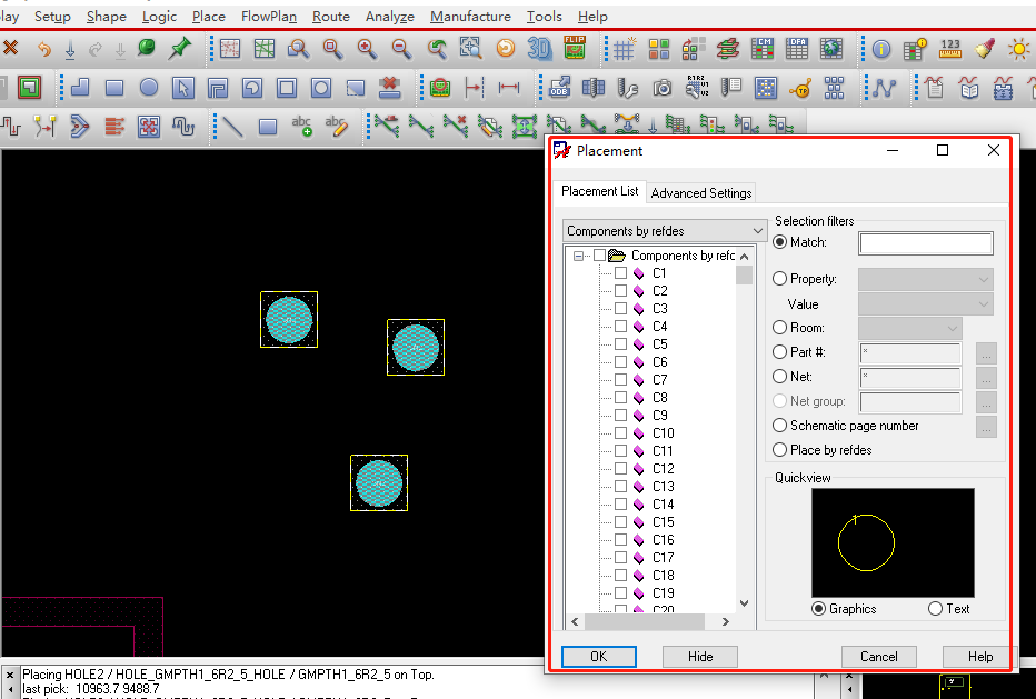 然后去原理图上依次点击需要放置的螺丝孔,比如要放置3个,就依次把这3个点击一下,然后回到PCB,在PCB上依次点击3下,就把这3个螺丝孔放到PCB上了。