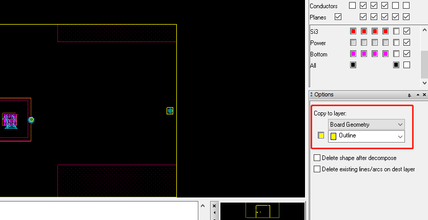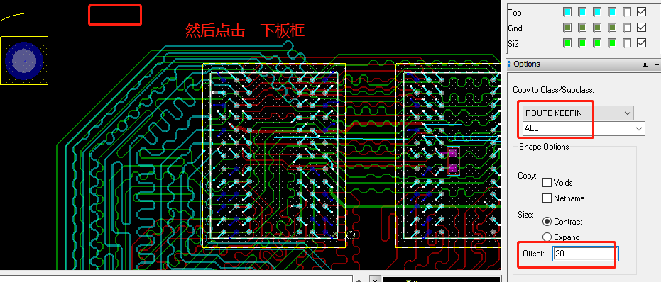 通常电源层有一个20H的原则,它是相对于它的参考层来说,比如:Si3层参考的是Power层,Si3层的走线间隔是4mil,那么Power层就需要相对板框内缩80mil。这个内缩的量有点大,通常我们做电源层切割的时候,不会把整个Power层都作为电源层,而是会把最外面这一层作为GND,作为GND的话只需要内缩20mil就行: