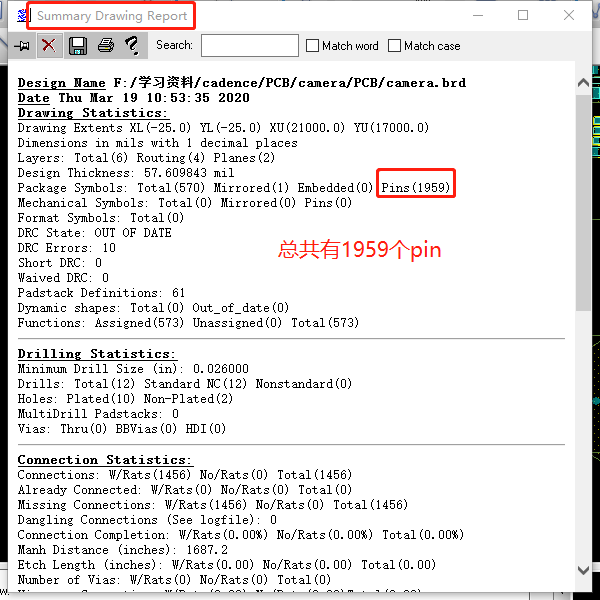 接下来查看一下总共有多少个pin:Tools->Quick Reports->Summary Drawing Report