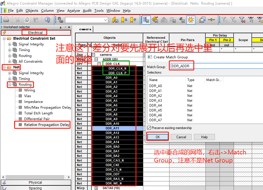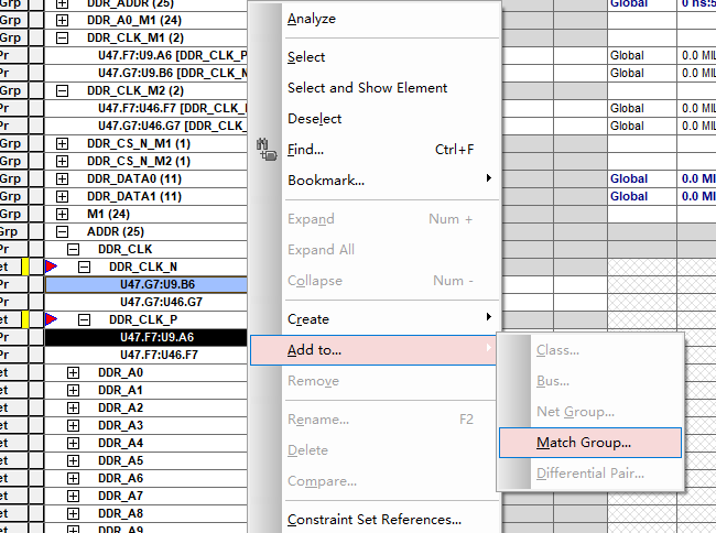 【注意,一定要将这个删掉。第一次设置完这个地址走线规则后,拉等长的时候发现不对,右下角不出现绿色的等长区间,检查规则发现这个group没有删掉,将其删掉之后就正常了】