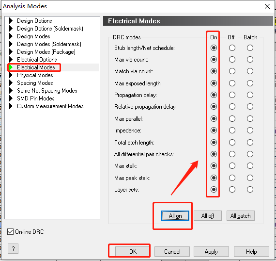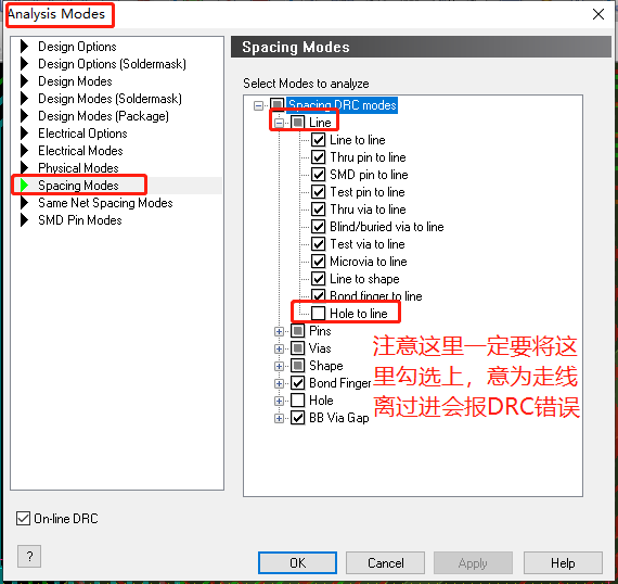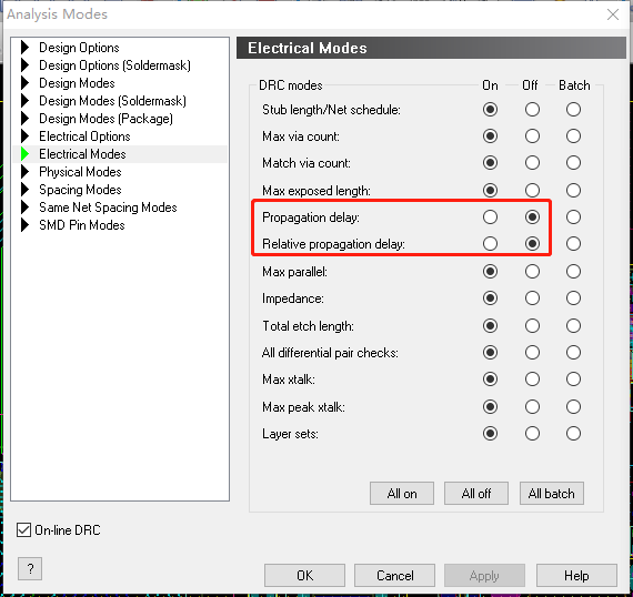 在ALLEGRO中关于无盘工艺还需要设置一个地方,否则走线从过孔上经过,不会报DRC错误:Setup->Constraints->Modes