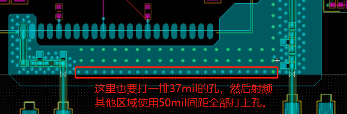 46、射频线最好走曲线,不要走直线,长度不能发生在射频波长的四分之一或者二分之一处。对于6层板,假如射频线走在第一层,其参考的层为第三层,但是第二层为GND,那么就需要把第二层在射频线下面的区域挖空,假如射频线宽是12mil,挖空的宽度可以为36mil。射频线周围打孔的孔间距,一般要求为波长的二十分之一的范围内,个人习惯孔间距为37mil。如果视频线周围铜皮相对较少的话,可以在线的周围打两排间距为37mil的孔,错落放置。