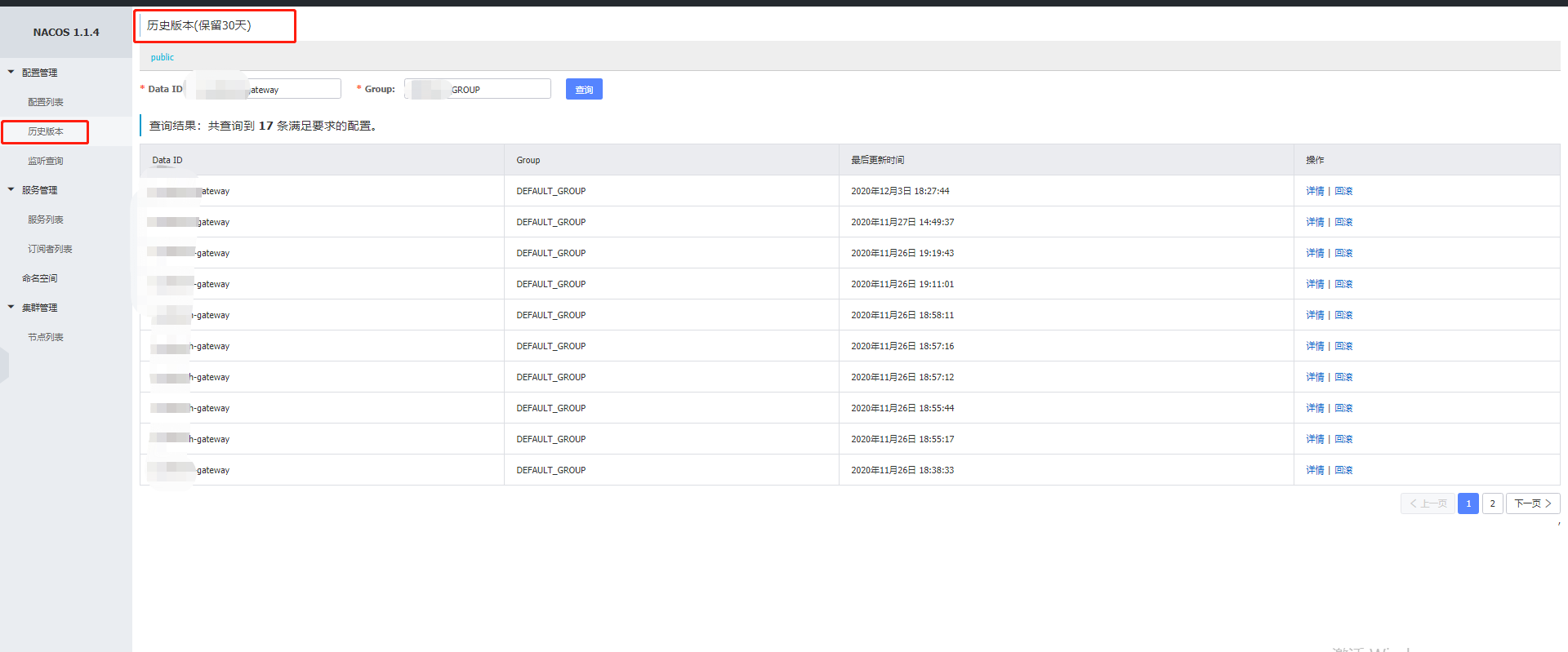 那么被删除的配置 应该怎么找回呢, 在配置管理-历史版本 中 只要知道 原有配置的Data ID、Group, 便可查询到之前删除的配置