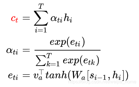 当前时刻权值e_t由 Decoder端隐藏层状态s_t-1 (query)和 Encoder端隐藏层状态h_t (key)计算得到;最终的attention由 权值e 和 Encoder端隐藏层状态h (value)计算得到