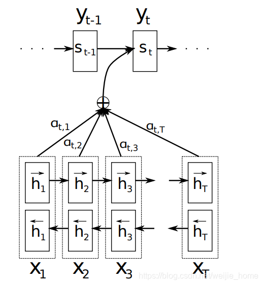 解码端Decoder的RNN cell, 以 s_t-1,y_t-1,c_t的拼接为输入 (y_t-1为Decoder端上一时刻输出, 即当前时刻输入),进行预测