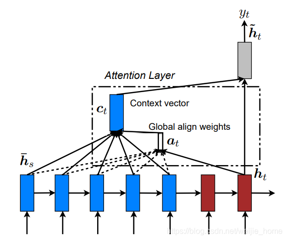 相比于上述Bahdanau Attention,该结构新添加concatenation layer (也可是其他模型结构),以Decoder端隐藏层状态s_t和当前时刻的语义向量C为输入,产生一个注意力隐状态,然后进行预测