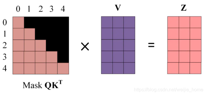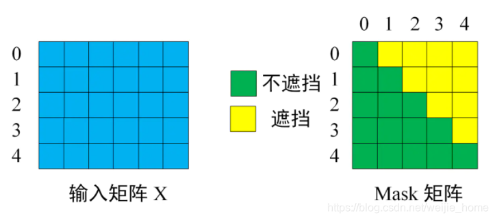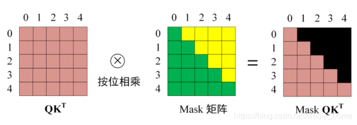 下图为Decoder端,输入矩阵"<Begin> I have a cat" (0, 1, 2, 3, 4) 和 mask矩阵 5×5