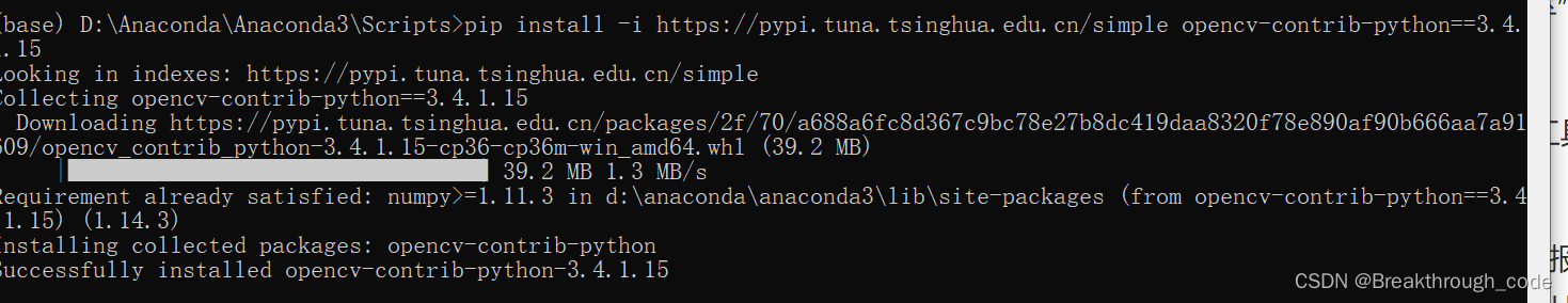 pip install -i https://pypi.tuna.tsinghua.edu.cn/simple opencv-contrib-python==3.4.1.15