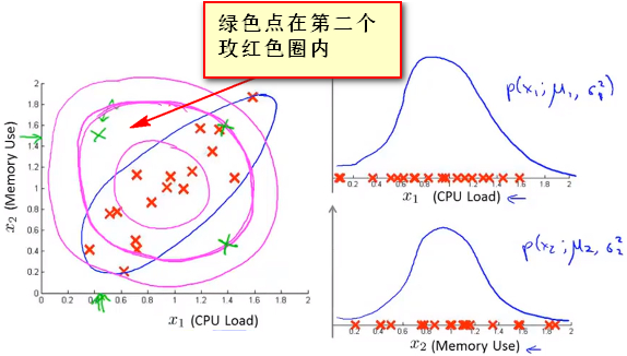 - 现使用高斯分布对特征进行拟合,计算出P(x),此时绿色的点表示 异常的样本点(CPU负载很低但是内存占用很高),但是根据两个变量的高斯分布单独进行拟合发现其并没有错误其距离中心并不是很远,即表示考虑单变量高斯分布,其P(x_test)并不是很小, 玫红色圆圈表示使用单变量高斯分布得到P(x)的等高线图 ,所以其并不会被判定为异常数据点
