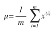 - 计算所有m个样本x ( i ) x^{(i)}x(i)(每个样本都可以表示为一个1 * n的向量)每个特征的平均值(对应特征求平均)μ \muμ所以μ \muμ也是一个1 * n的向量,向量中的每个单元都是所有样本对应特征的平均值。