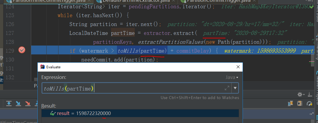 里面需要 watermark > toMills(partTime) + commitDelay 成立 时才会把分区添加到需要提交分区列表中,这里是问题的关键,里面的 toMills(partTime) 方法转为毫秒时间时 会把 partTime 时间 往后8小时,所以会一直大于watermark 的值一直无法添加分区到需提交分区列表中