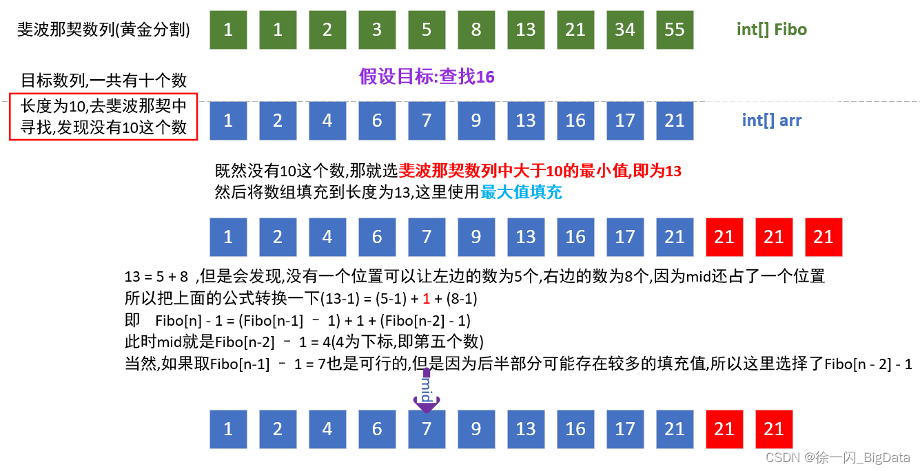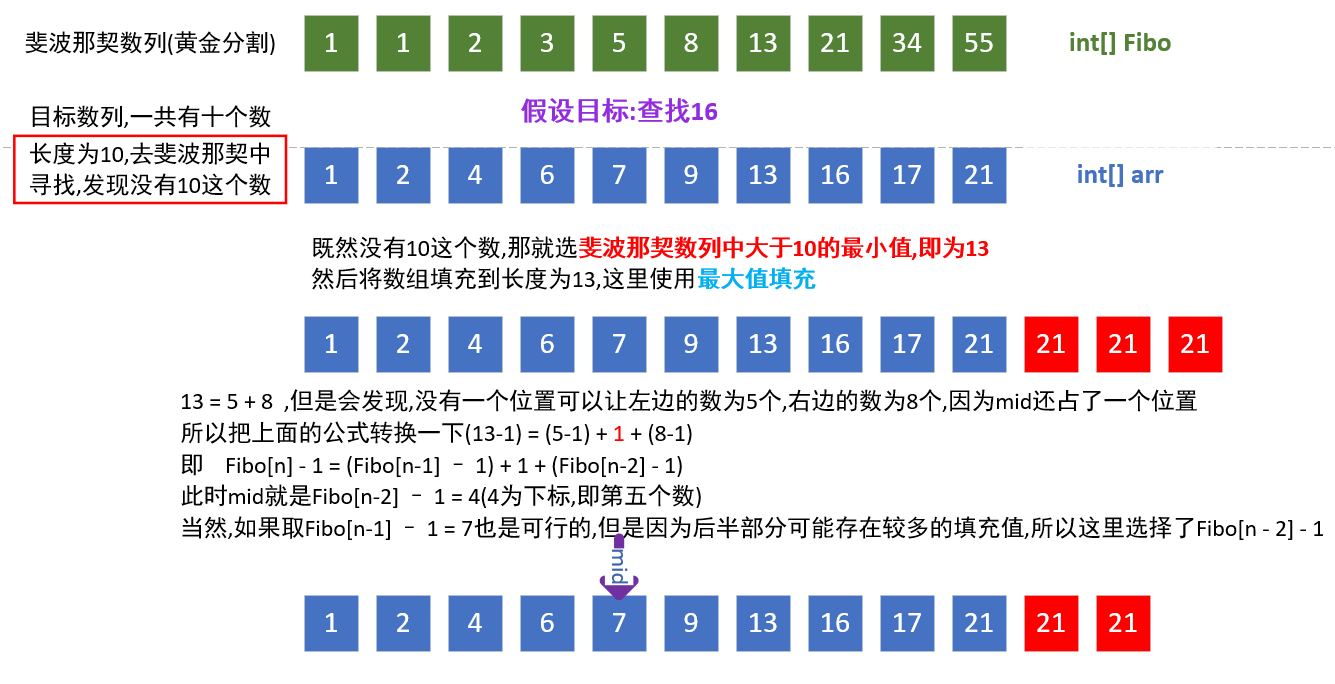 和二分查找和插值查找类似,就是mid的选取概念不一样,斐波那契查找是选用黄金分割点.如下图,是一次选取mid点的流程