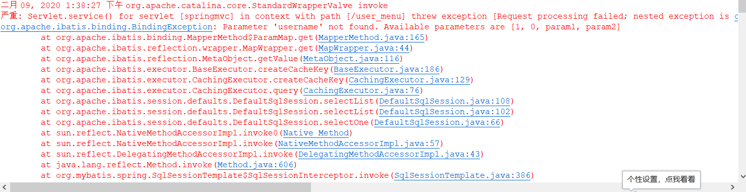 严重: Servlet.service() for servlet [springmvc] in context with path [/user_menu] threw exception [Request processing failed; nested exception is org.mybatis.spring.MyBatisSystemException: nested exception is org.apache.ibatis.binding.BindingException: Parameter 'username' not found. Available parameters are [1, 0, param1, param2]] with root cause
