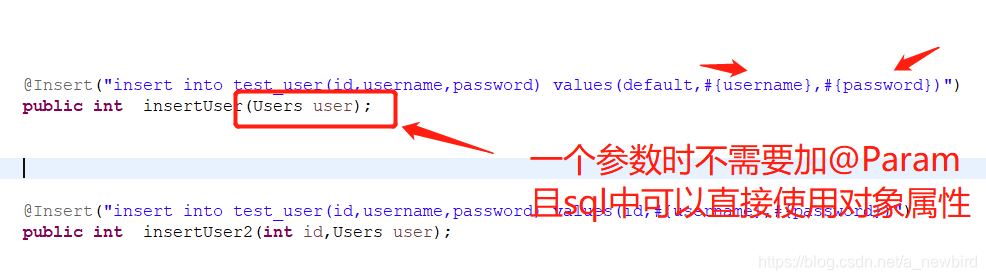 当只有一个参数(基本变量或者对象参数)时,Mapper/Dao层中的方法是可以不使用注解的。如果参数为对象,sql语句中可以直接使用对象的属性