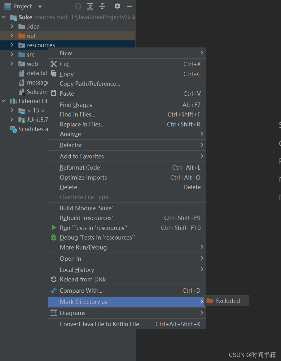 一般用于标注排除目录。被排除的目录不会被 IntelliJ IDEA 创建索引,相当于被 IntelliJ IDEA 废弃,该目录下的代码文件是不具备代码检查和智能提示等常规代码功能。