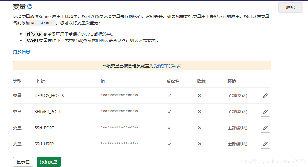 这里使用了一些变量参数,有一些是gitlab-ci内置的参数,有一些是在gitlab-runner里面自己设置的参数