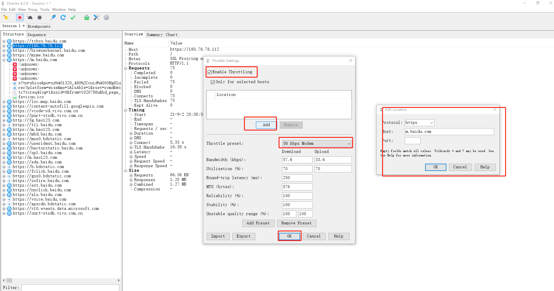 6.选中Enable Throttling,点击Add,将复制的手机端url粘贴进host,并选中延迟最高,点击确定