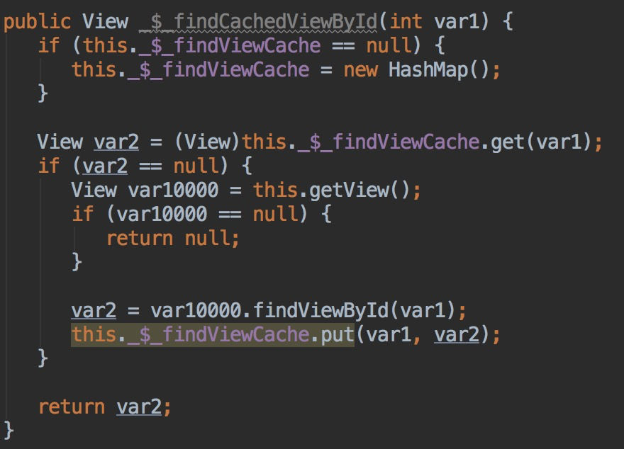 可以看到,在这个方法里有一个名为findViewCache的HashMap,用来缓存每次找到的View,避免每次对View进行操作时都重新调用findViewById方法,是的,在这里,仍然是通过findViewById去获取控件的,而且每个控件的第一次使用都会调用findViewById方法,后续的使用可以在findViewCache中去获取。