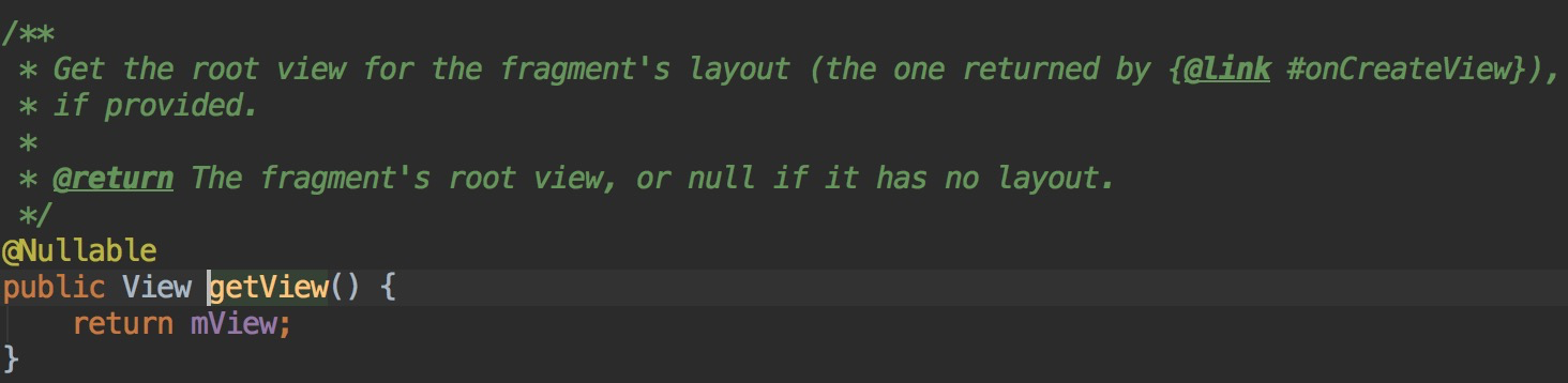 可以看到,fragment对应的findCachedViewById方法与activity对应的有所不同,它需要先调用getView方法,然后再通过getView返回的值去findViewById,那么getView方法的返回值其实是mView,也就是fragment的根view: