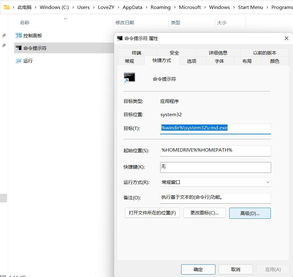 右键点击固定到开始界面的命令提示符时,选择"打开文件位置",再右键点击那个快捷方式,