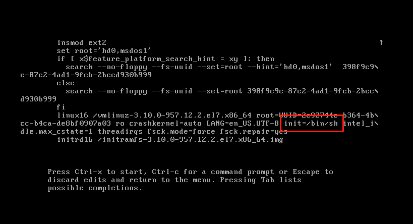 3.修改完毕后,按Ctrl-x,成功进入单用户模式。
