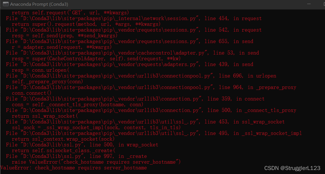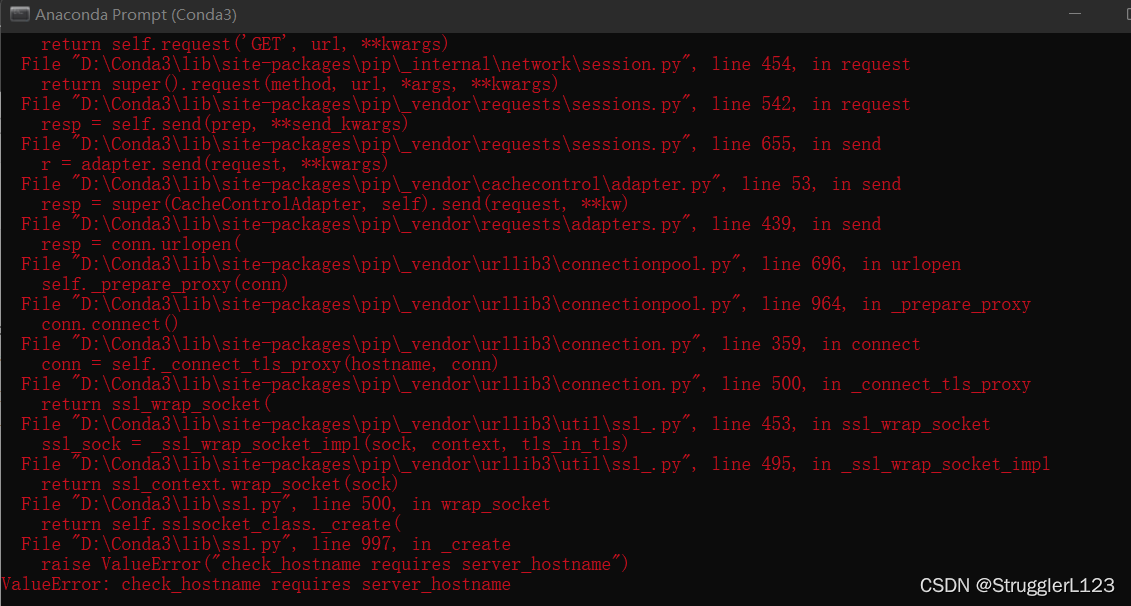 今天在使用anaconda的prompt下载python包的时候,老是下载失败,直接出现一堆红色,如下图所示: