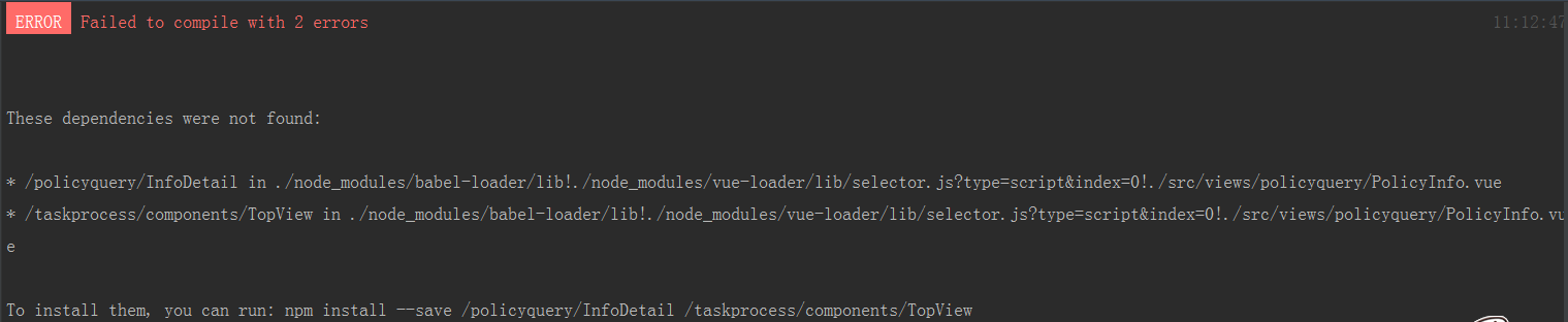 错误:是说出现问题的文件在 ./src/views/policyquery/PolicyInfo.vue 里,查找发现是引入的路径写的不对;纳入