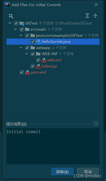 4、选择初始化要提交推送的文件,一般.idea文件夹、.iml文件、编译的文件夹out或者target不上传